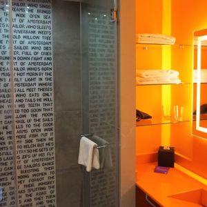 Het eerste wat opvalt als we onze kamer in lopen is de gave muurbeschildering. BAM! Daar kan je niet omheen. Een echte eyecatcher. De grote ramen zorgen ervoor dat de kamers erg licht zijn. Kijkend uit het raam is mijn uitzicht de ingang van het Ziggo Dome. Jeetje, hoe relaxt is dat! Eerst naar een concert gaan en daarna slapen bij de buren!
